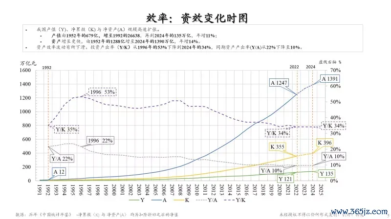 2022 年,我国产值达到约123万亿元东谈主民币。同期的资产总量已稀奇 1200 万亿元,资产范围增长赶快,甚而可能快于产值的增长速率,这主要成绩于我国较高的储蓄率与投资率。由此扩展出一个需要关切的着力问题:产值与资产(或成本)的匹配着力,以及处事着力的晋升问题。