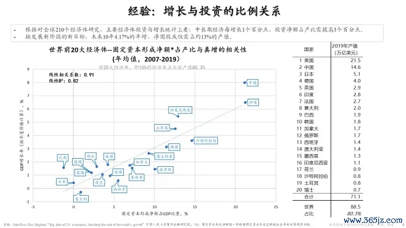 咱们的经济发展在系统性地增长着。把柄对全球210个经济体磋商,基本上不错找到增长和投资的干系,终点是从前20大主要经济体投资与增长统计上看,中恒久经济每增长1个百分点,投资净额占产值比需提高3个百分点。跟着投资额的增多,经济增长的速率也会变得相比高。要是中国明天10年年均增长需达到4.2%附近,净投资率可能需要13%。