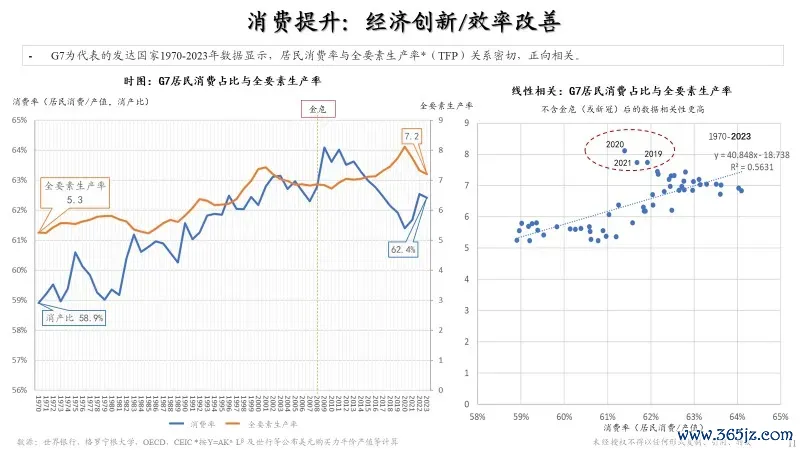 对于提振猝然、提振经济,咱们关切到一个相比挑升念念的磋商角度,G7为代表的证实国度1970-2023年数据表露,全要素分娩率的晋升可能推高了猝然率的提高。全要素分娩率不错行为平均的科技发展的水平,便是成本和东谈主力以外,多样工夫改进等等产生的分娩晋升。证实国度教导表露在相等长的经济发展中住户猝然率与全要素分娩率干系密切,正向议论。